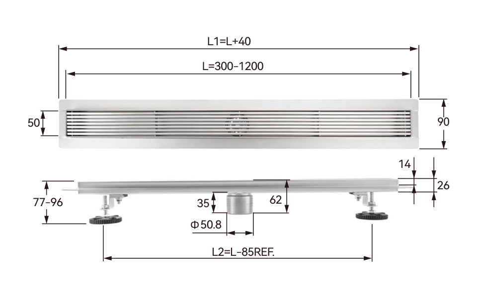 Linear edge shower drain with horizontal outlet and PP siphon 50mm width series