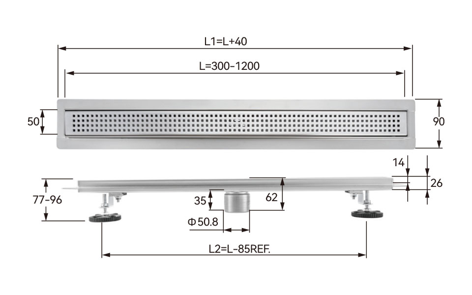 Linear edge shower drain with horizontal outlet and PP siphon 50mm width series