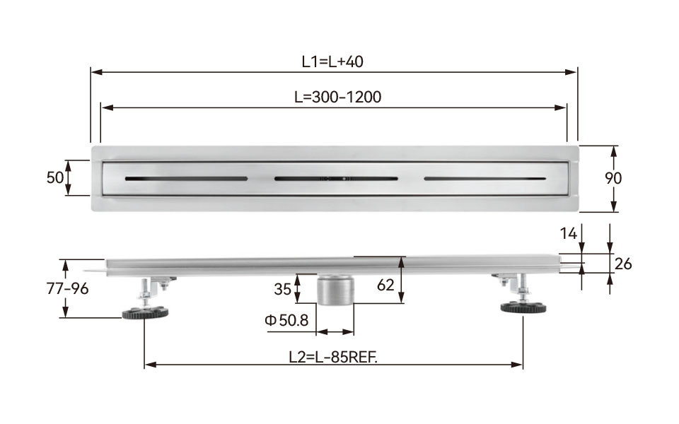 Linear edge shower drain with horizontal outlet and PP siphon 50mm width series