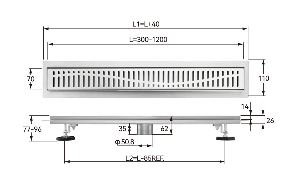 Linear edge shower drain with horizontal outlet and PP siphon 70mm width series