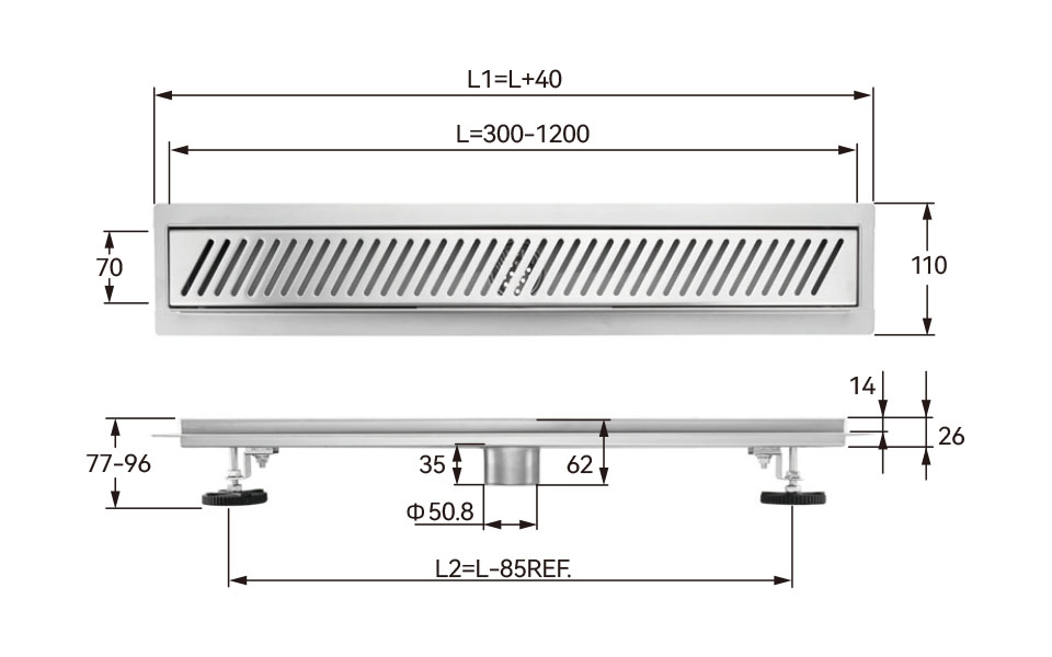 Linear edge shower drain with horizontal outlet and PP siphon 50mm width series