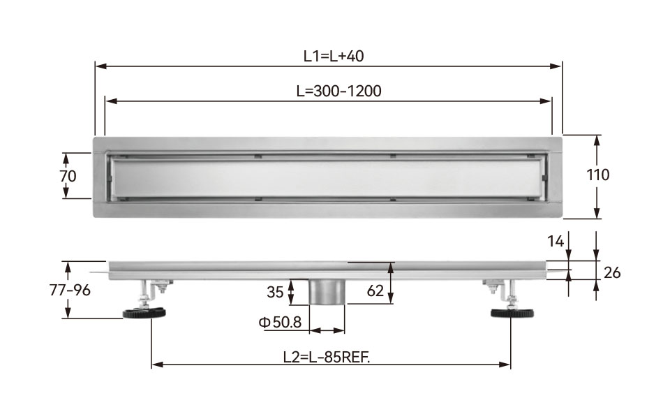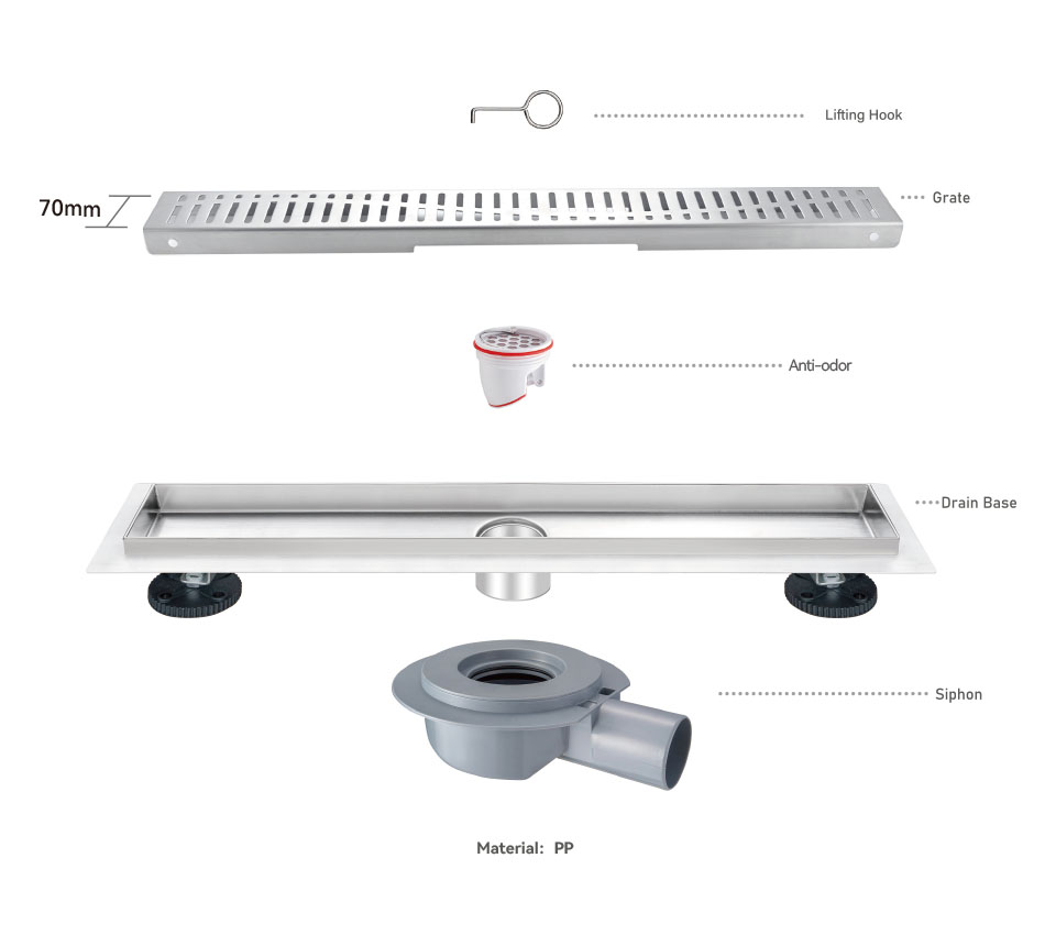 Linear edge shower drain with horizontal outlet and PP siphon 70mm width series