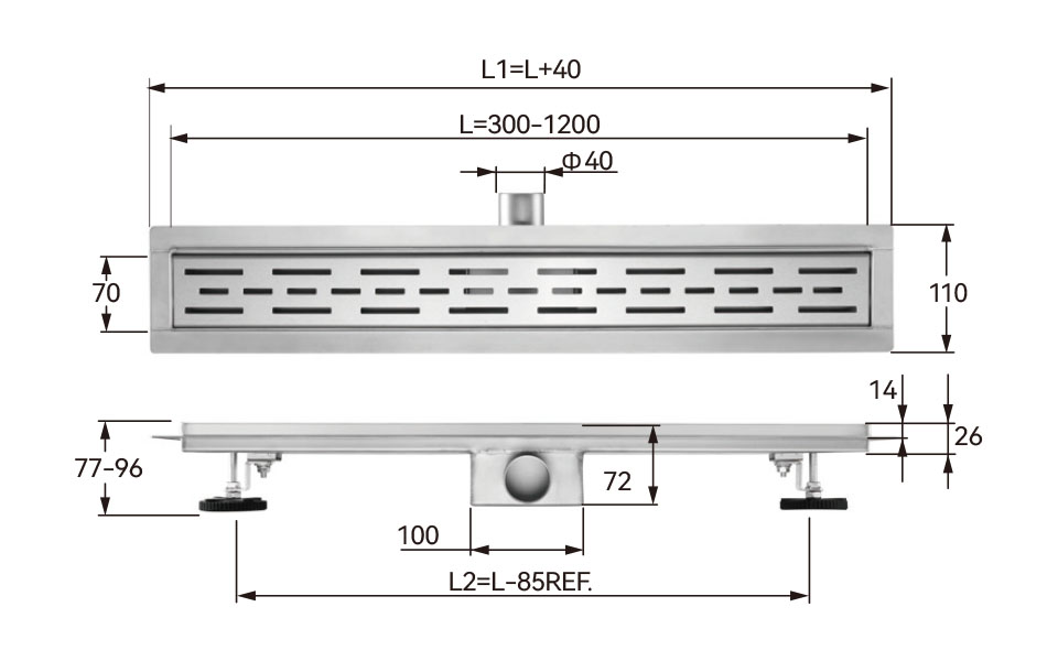 Linear edge shower drain with horizontal outlet and PP siphon 70mm width series