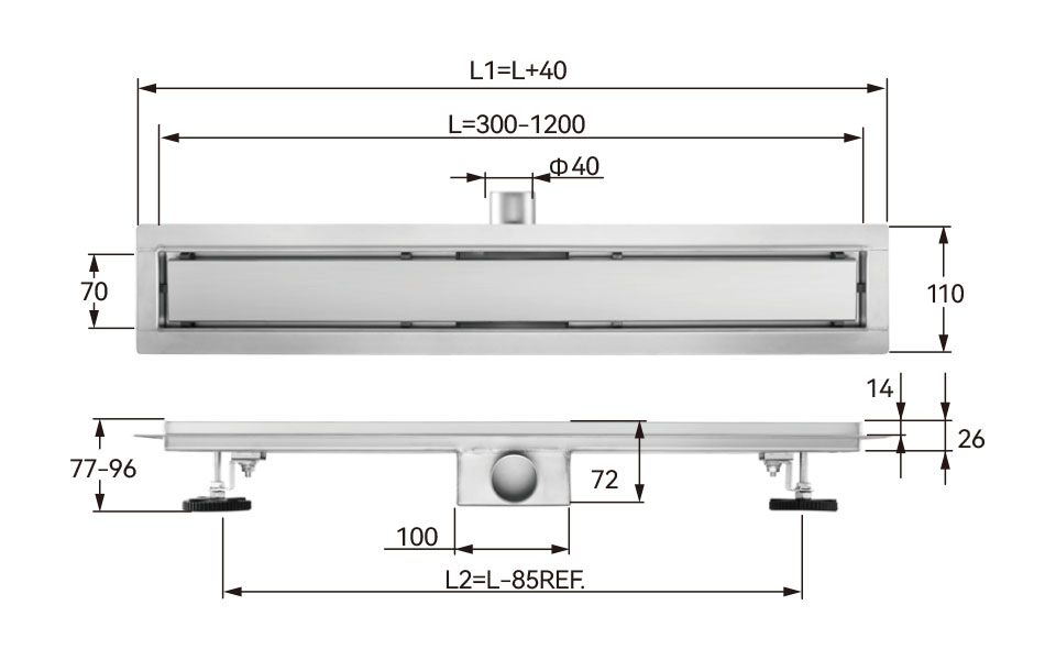 Linear edge shower drain with horizontal outlet and PP siphon 70mm width series