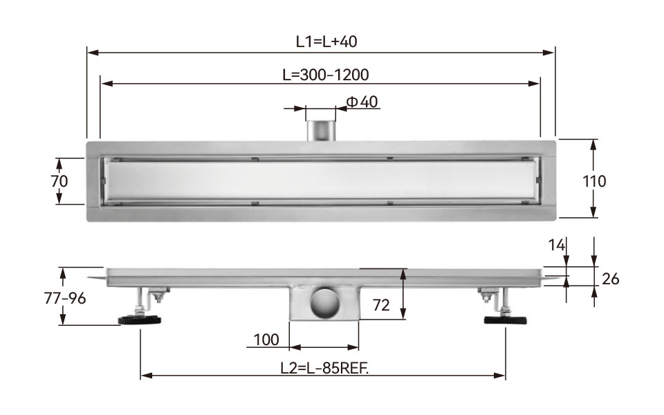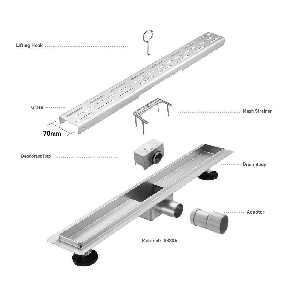 Linear edge shower drain with horizontal outlet and PP siphon 70mm width series