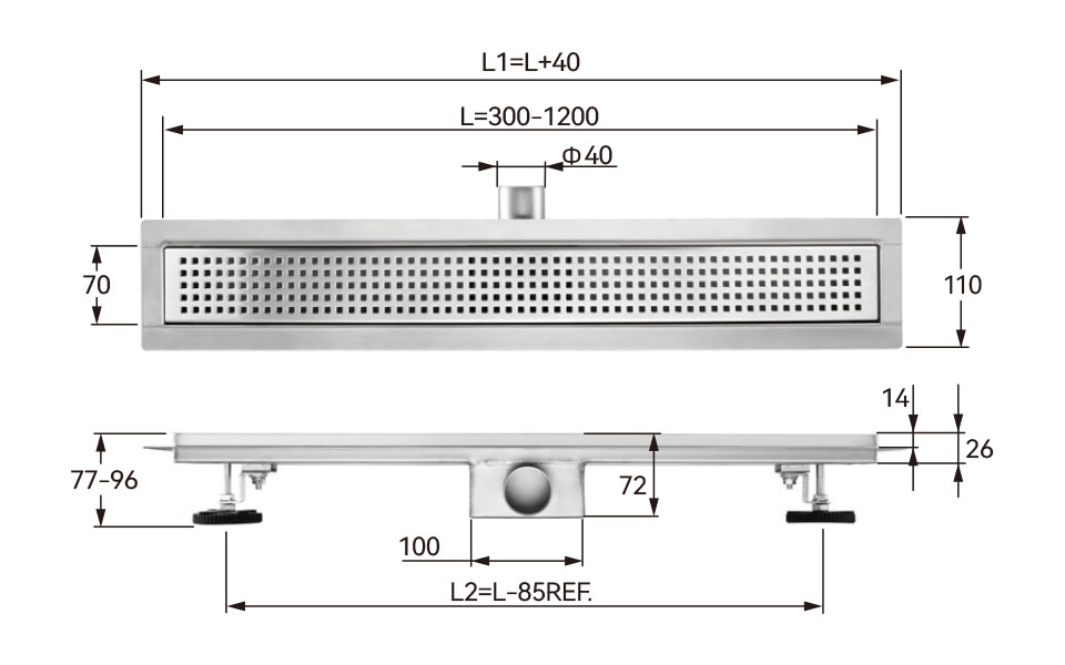 Linear edge shower drain with horizontal outlet and PP siphon 70mm width series
