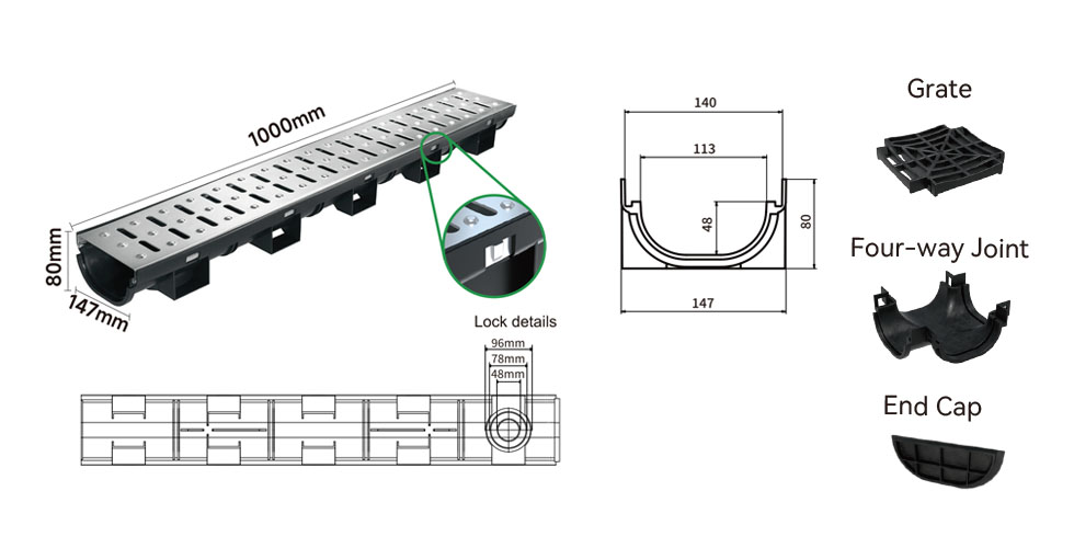 Linear edge shower drain with horizontal outlet and PP siphon 70mm width series