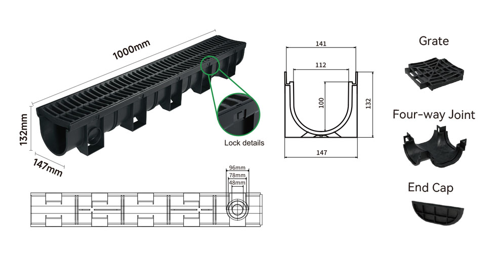 Linear edge shower drain with horizontal outlet and PP siphon 50mm width series