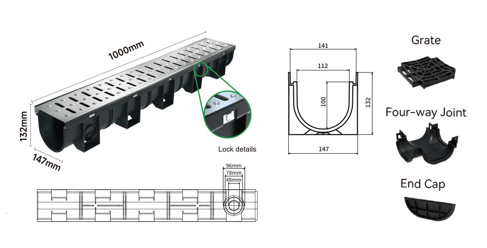 Linear edge shower drain with horizontal outlet and PP siphon 50mm width series